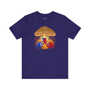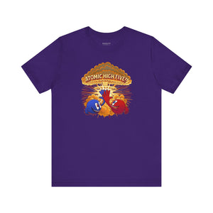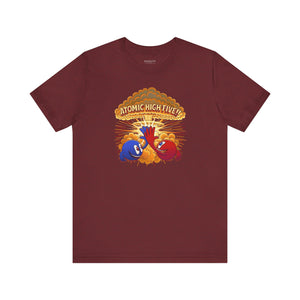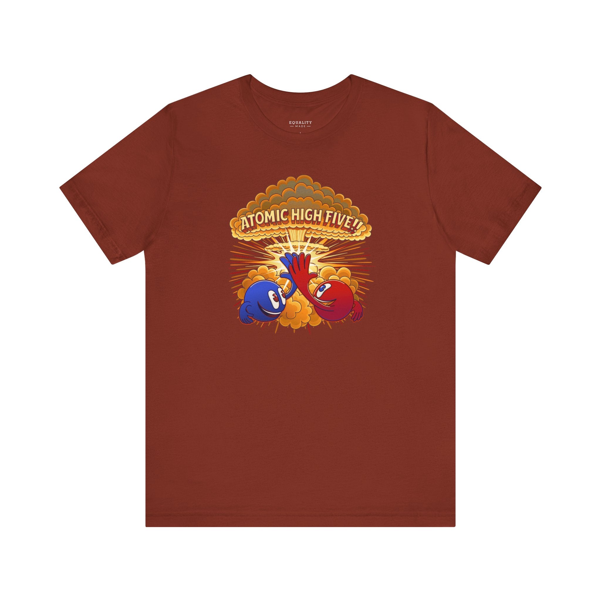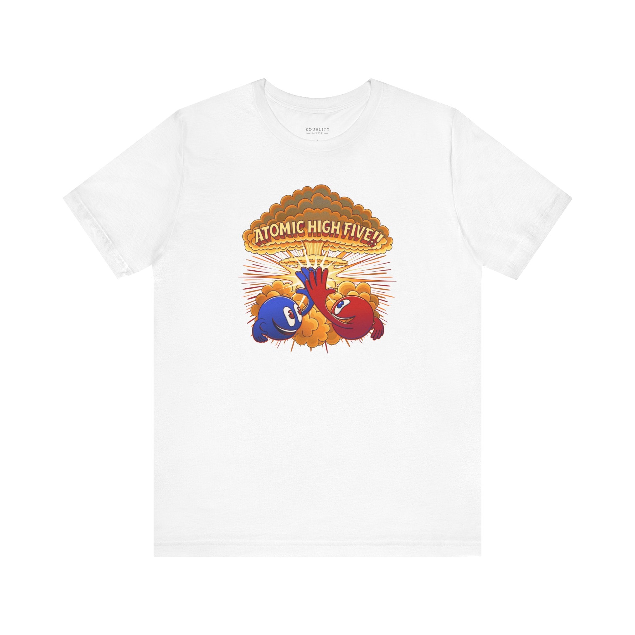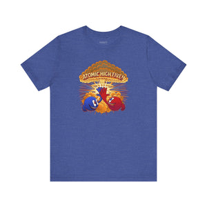 Epic tee featuring two guys giving an explosive high five with atomic explosion background and 'Atomic High Five' text. Celebrate friendship with explosive enthusiasm!
