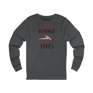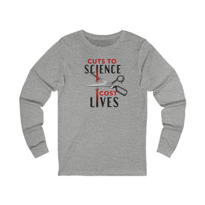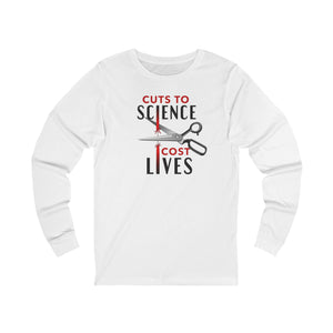 Warm long sleeve featuring 'Cuts to Science Cost Lives' message. Stay cozy while advocating for proper science funding and evidence-based policy that protects public health.