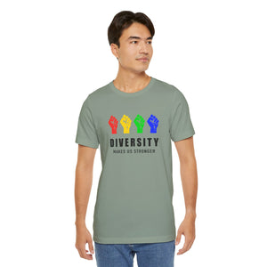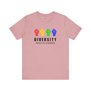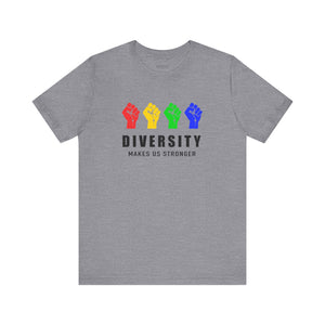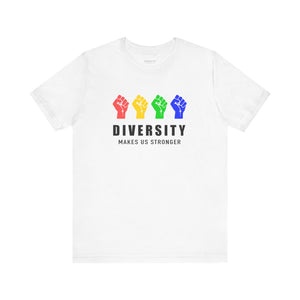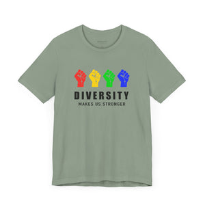 Bold design featuring colorful raised fists with 'Diversity Makes Us Stronger' message. Celebrate unity, inclusion, and the power of our differences with this empowering statement tee.