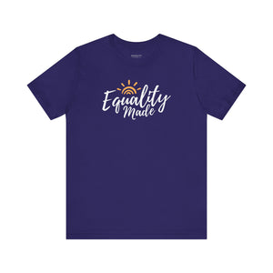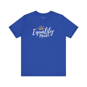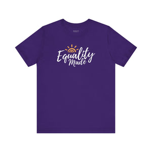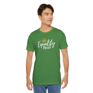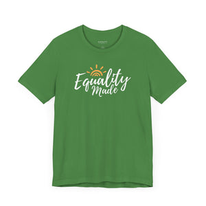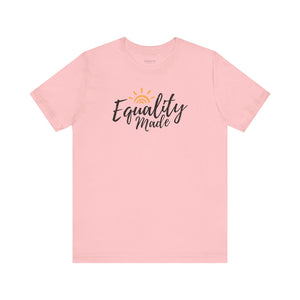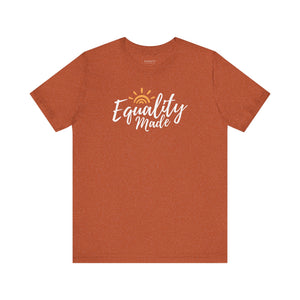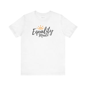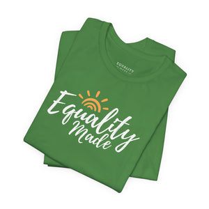 Inspiring 'Equality Made' tee featuring a sunrise over the word Equality. Showcase your commitment to inclusion with our signature brand design celebrating hope and new beginnings.