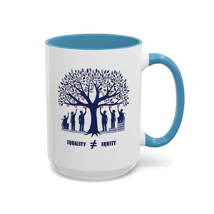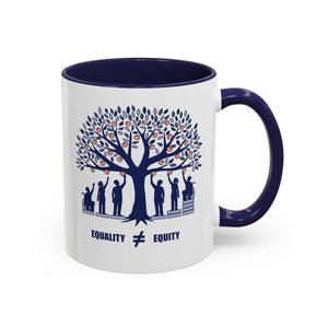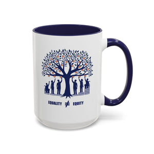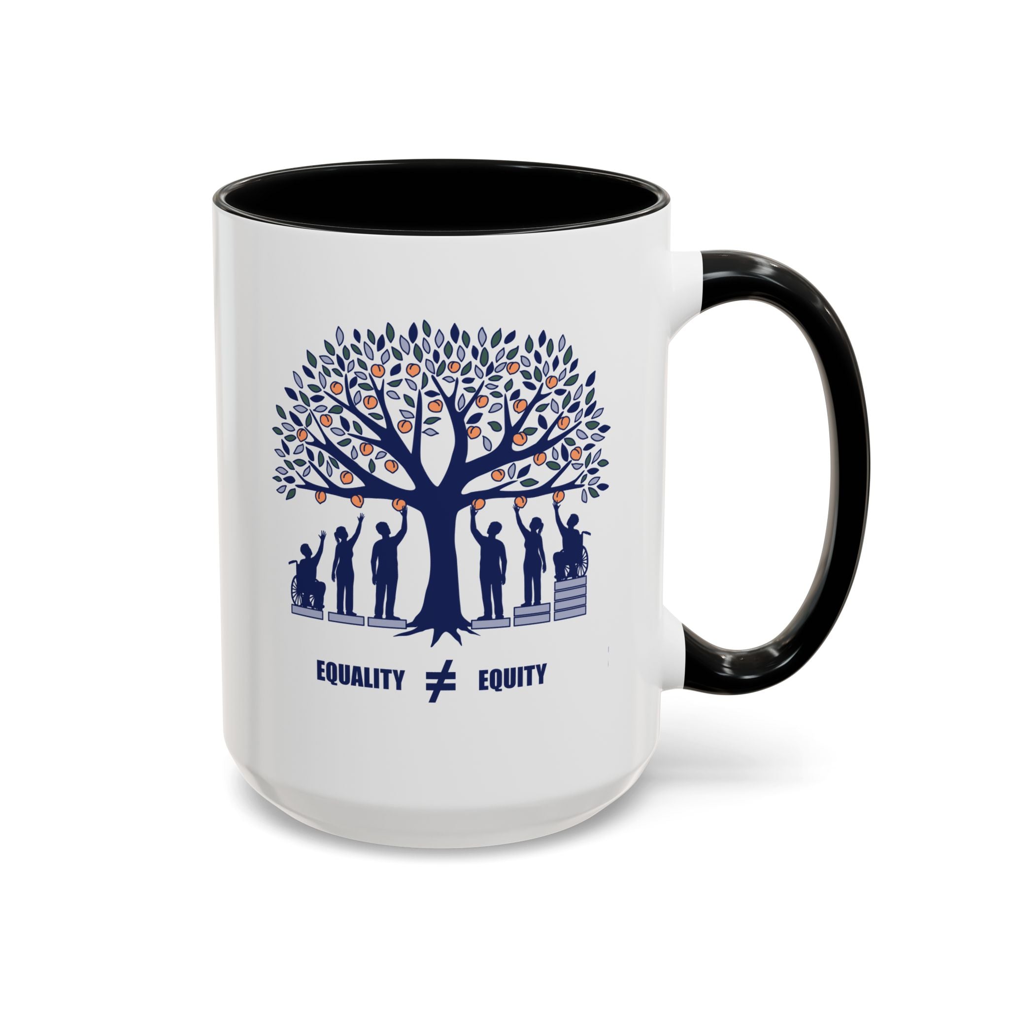 This ceramic mug features an original illustration depicting the vital difference between equality and equity. On one side, everyone stands beneath a peach tree with identical tools—regardless of whether they're young, elderly, or disabled. On the other, each person has exactly what they need to reach the fruit. Same goal. Different paths. That's the point.