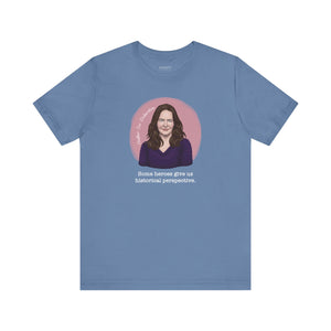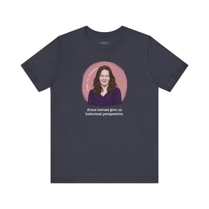 Inspiring tee featuring Heather Cox Richardson illustration with 'Some heroes give us historical perspective' text. Honor the historian hero with this Heroes Collection design.