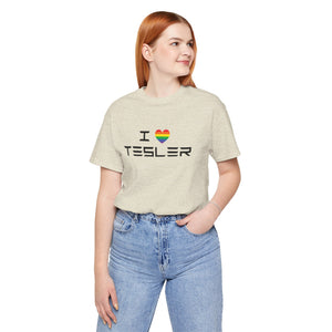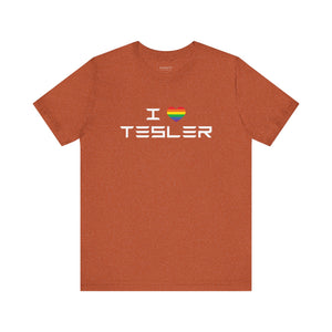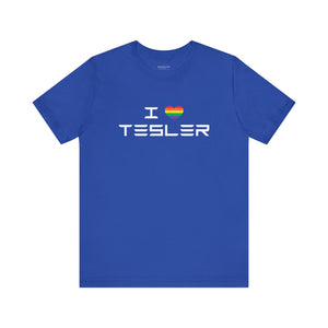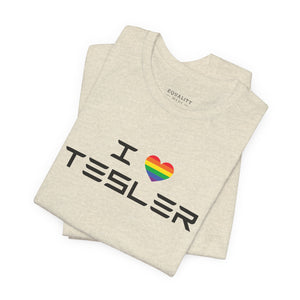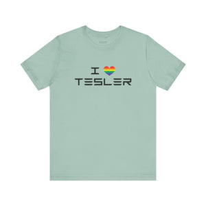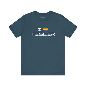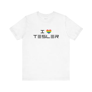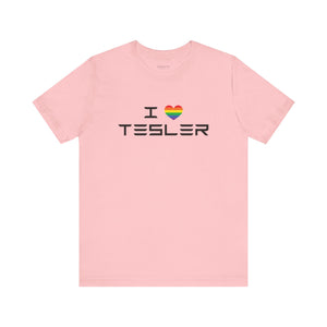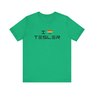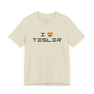 'I Love Tesler' tee with rainbow heart. This playful design gently mocks a famous electric car company while proudly showing support for the LGBTQ+ community.