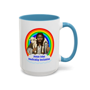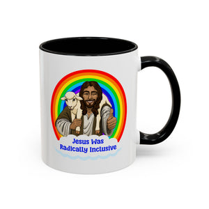 Sturdy ceramic mug with Jesus carrying lamb and 'Radically Inclusive' message with color-accented handle and interior. Enjoy your coffee while celebrating Christ's universal love.