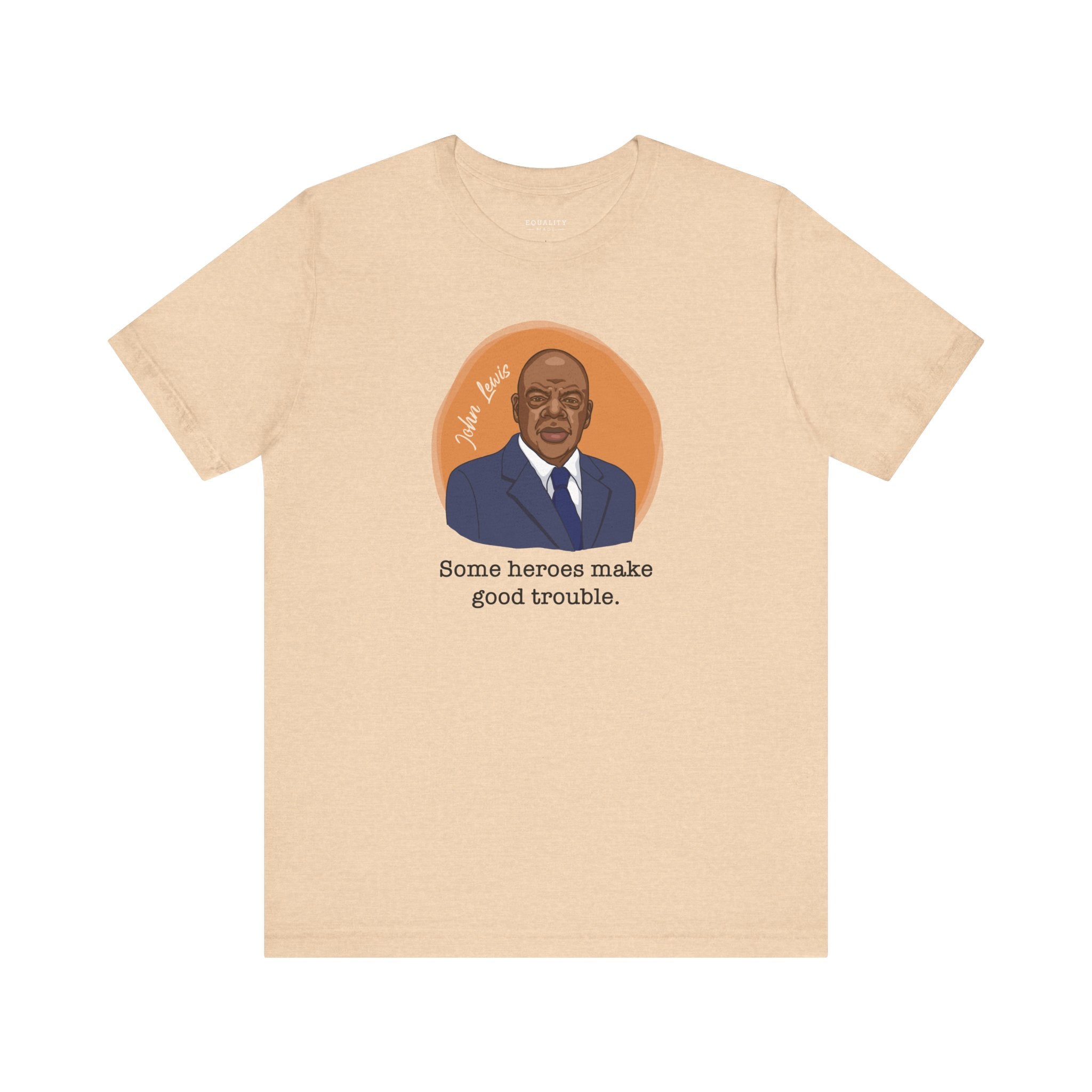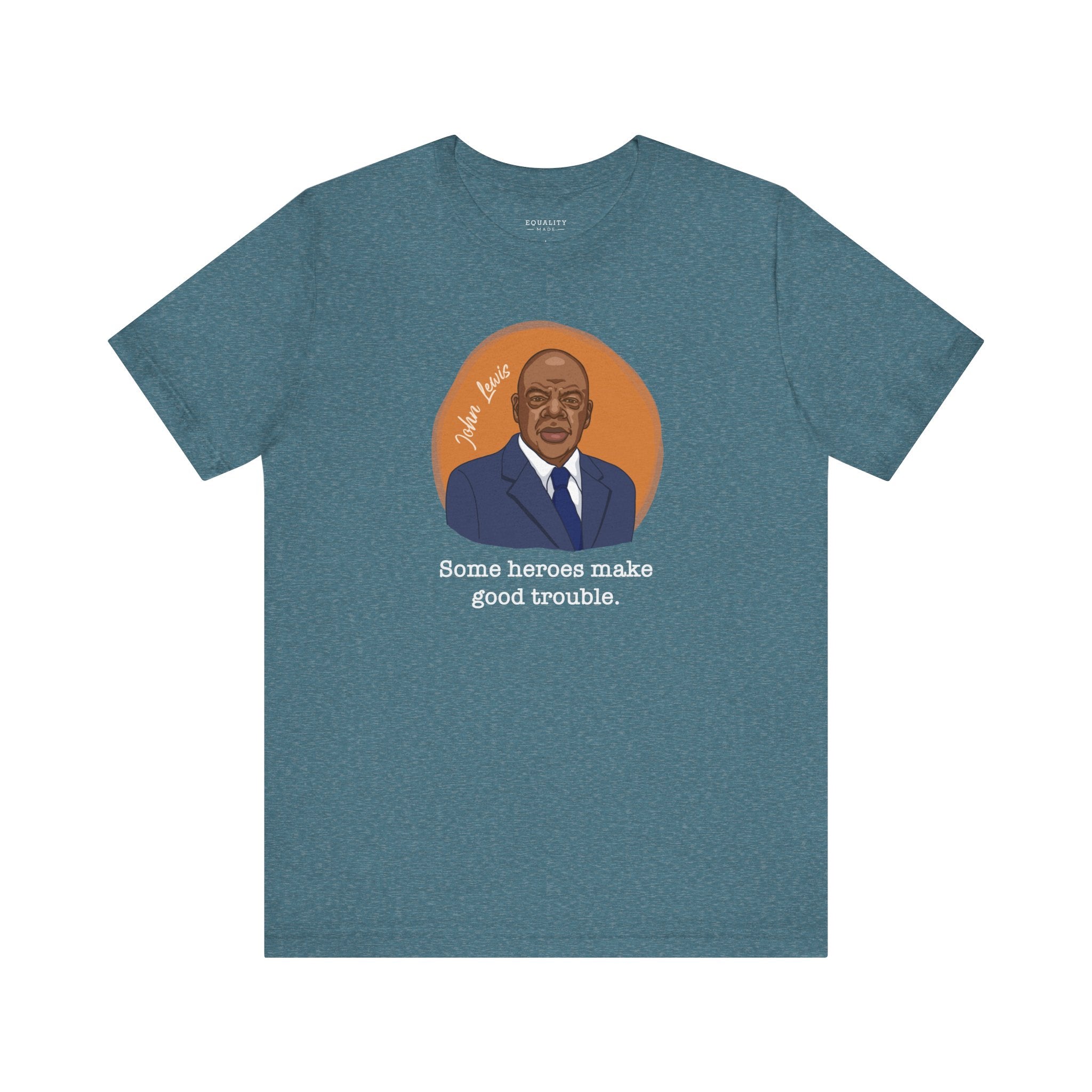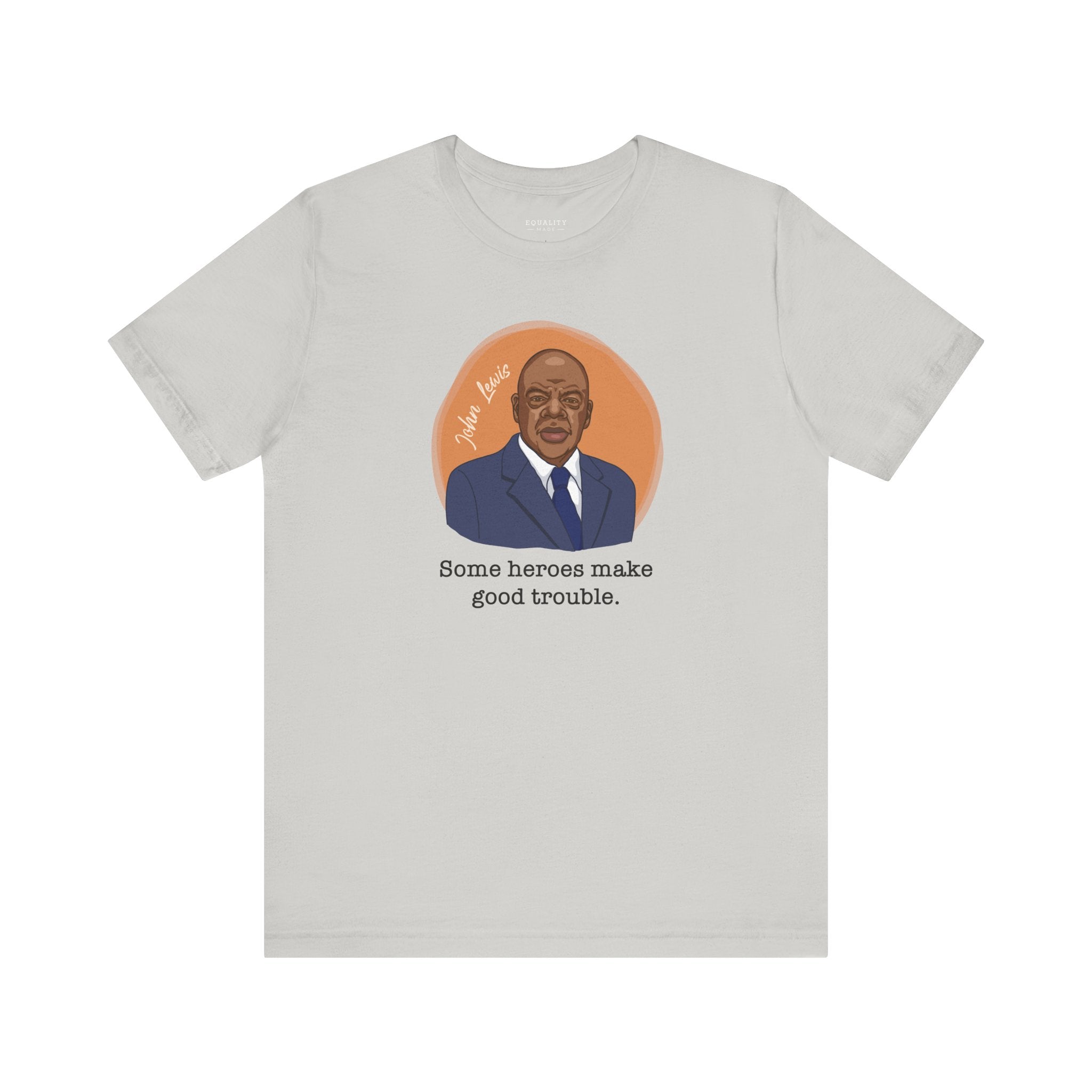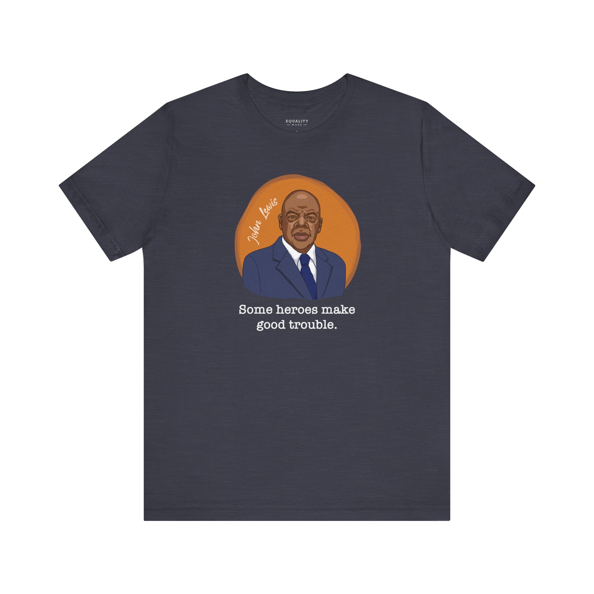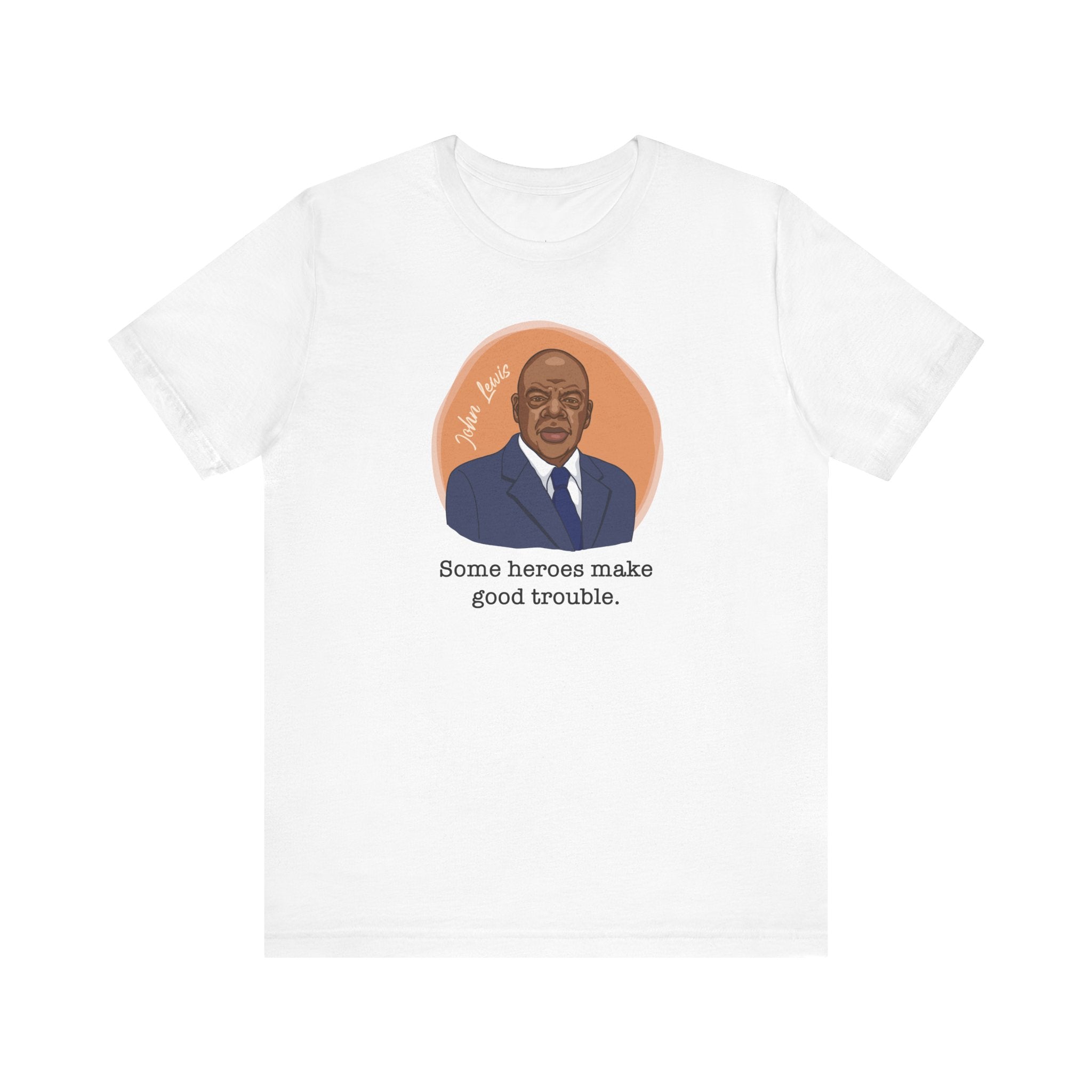 Inspiring tee featuring John Lewis illustration with 'Some heroes make good trouble' text. Honor the civil rights icon's legacy with this powerful Heroes Collection design.