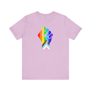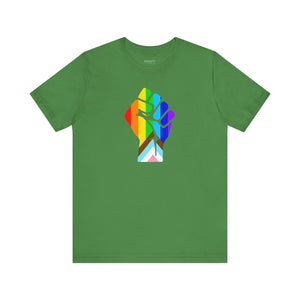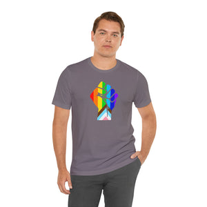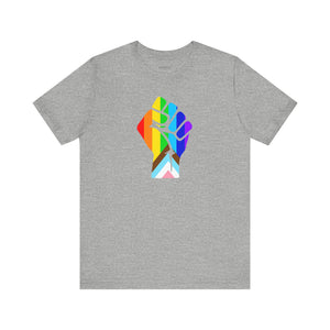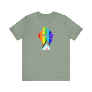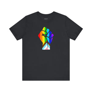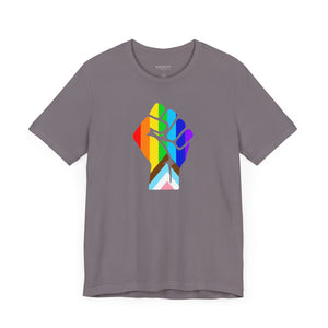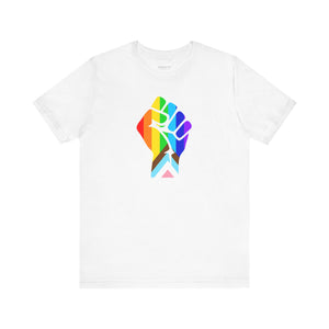 Powerful raised fist in vibrant rainbow colors symbolizing solidarity with the LGBTQ+ community. Stand proud for equality, visibility, and inclusion with this bold statement tee.