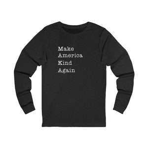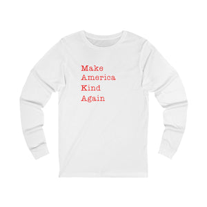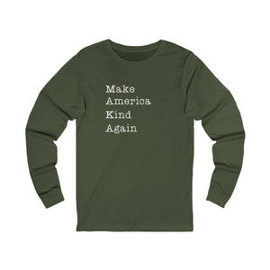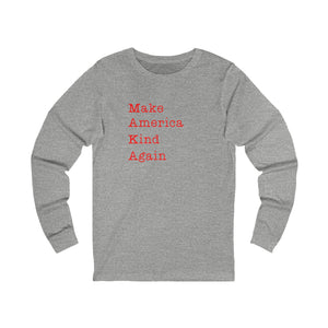 Cozy long sleeve featuring 'Make America Kind Again' message. Stay warm while promoting compassion, unity and a return to respectful discourse in our divided nation.
