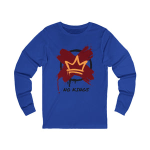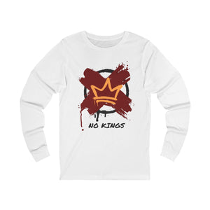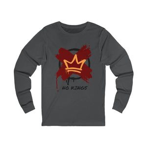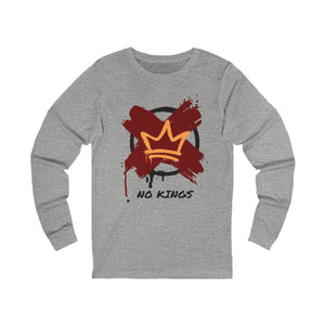 Edgy long sleeve featuring grunge 'No Kings' design with spray-painted crown and red X. Stay warm while making a bold statement about American democracy and freedom.