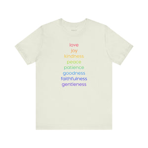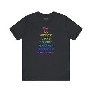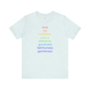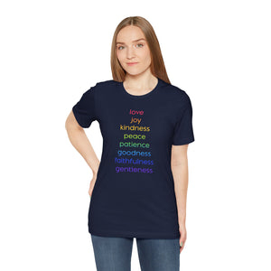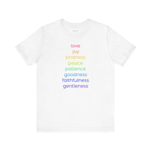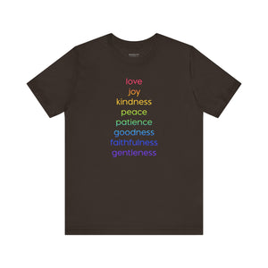 Uplifting design celebrating universal virtues: love, joy, kindness, peace, goodness, and patience. Spread positivity and promote equality with this meaningful, conversation-starting tee.