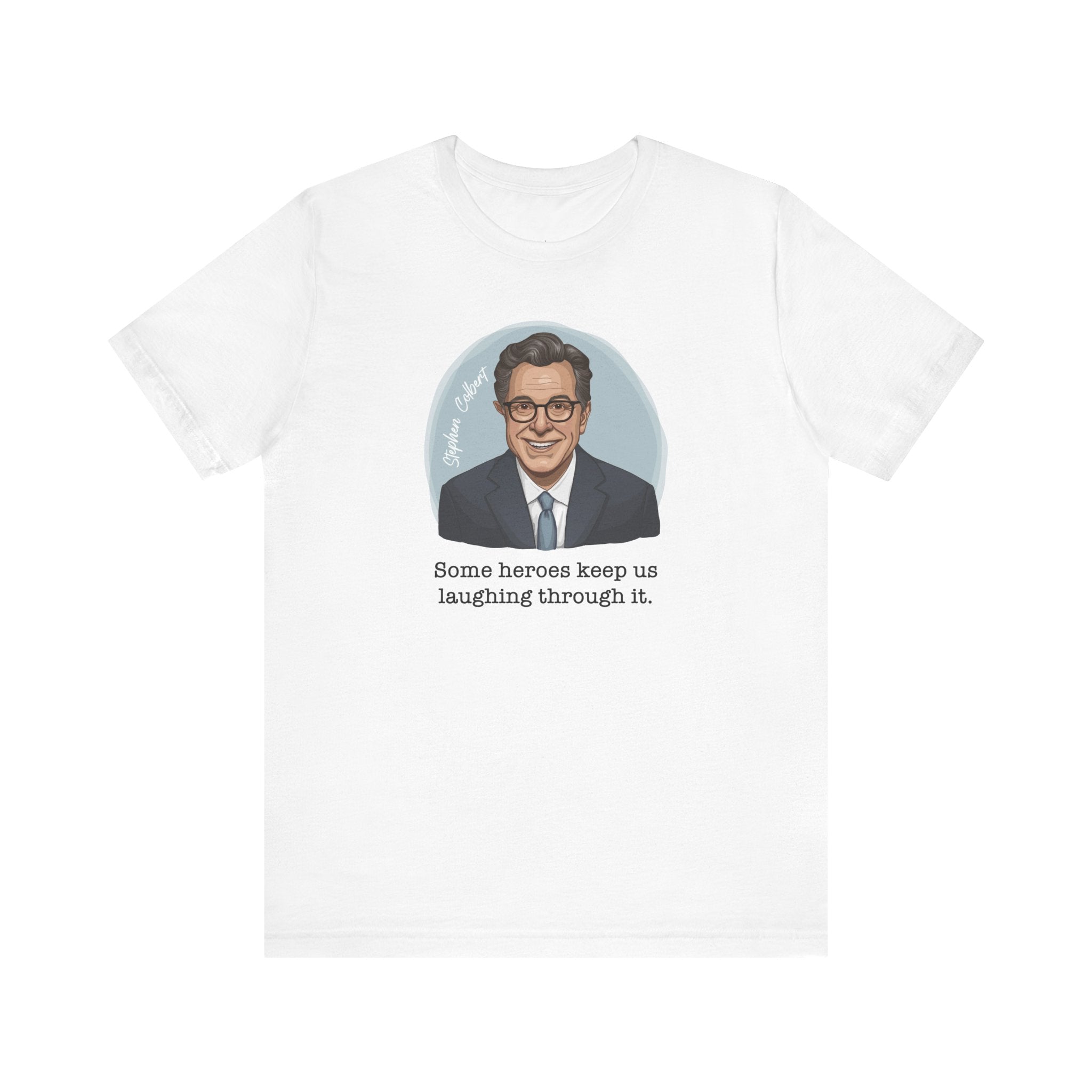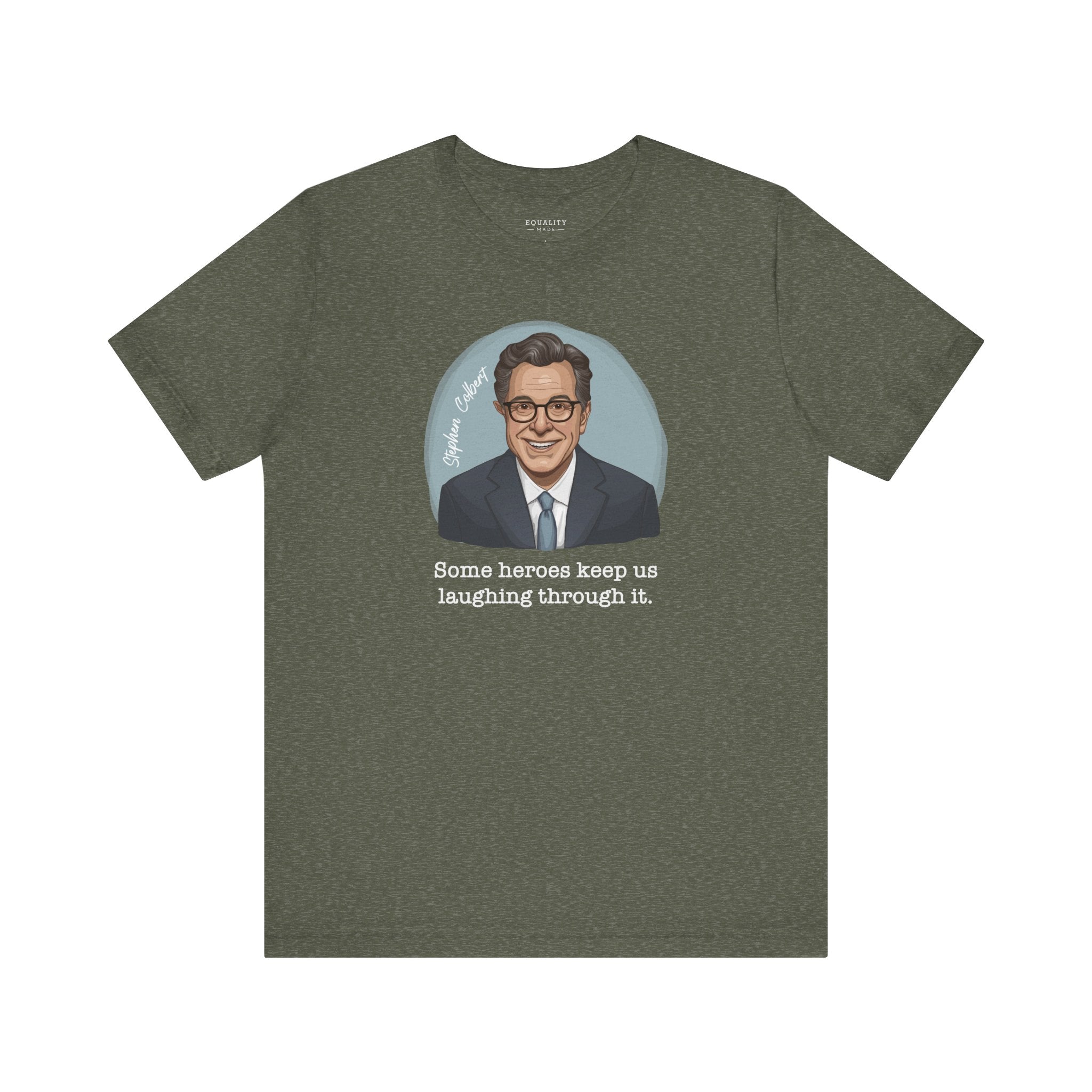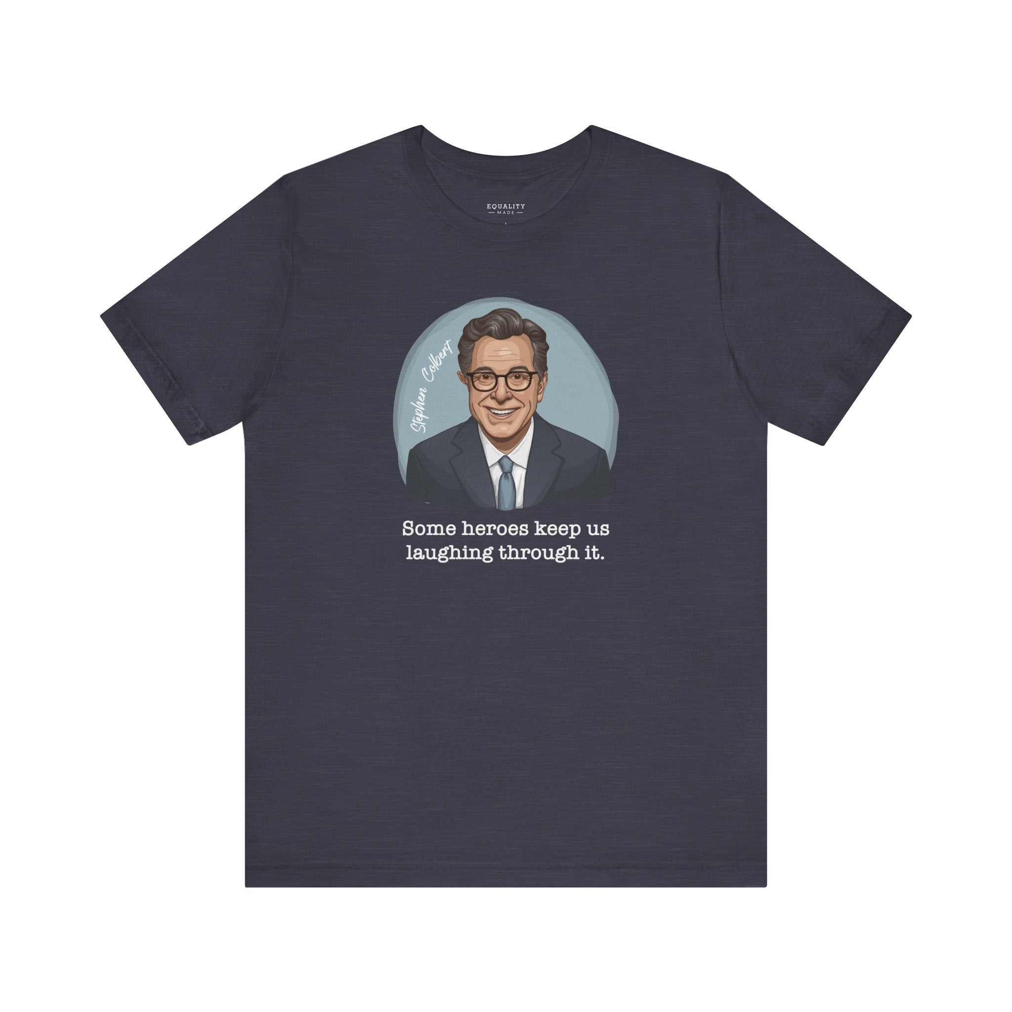 Uplifting tee featuring Stephen Colbert illustration with 'Some heroes keep us laughing through it' text. Celebrate comedy heroes with this inspiring Heroes Collection design.