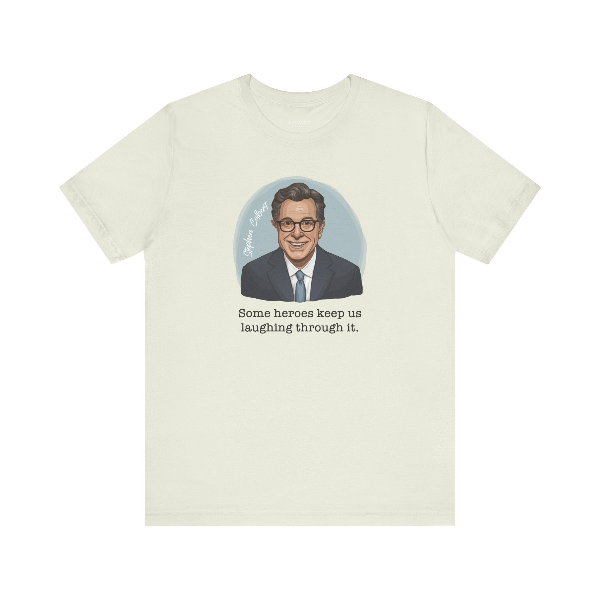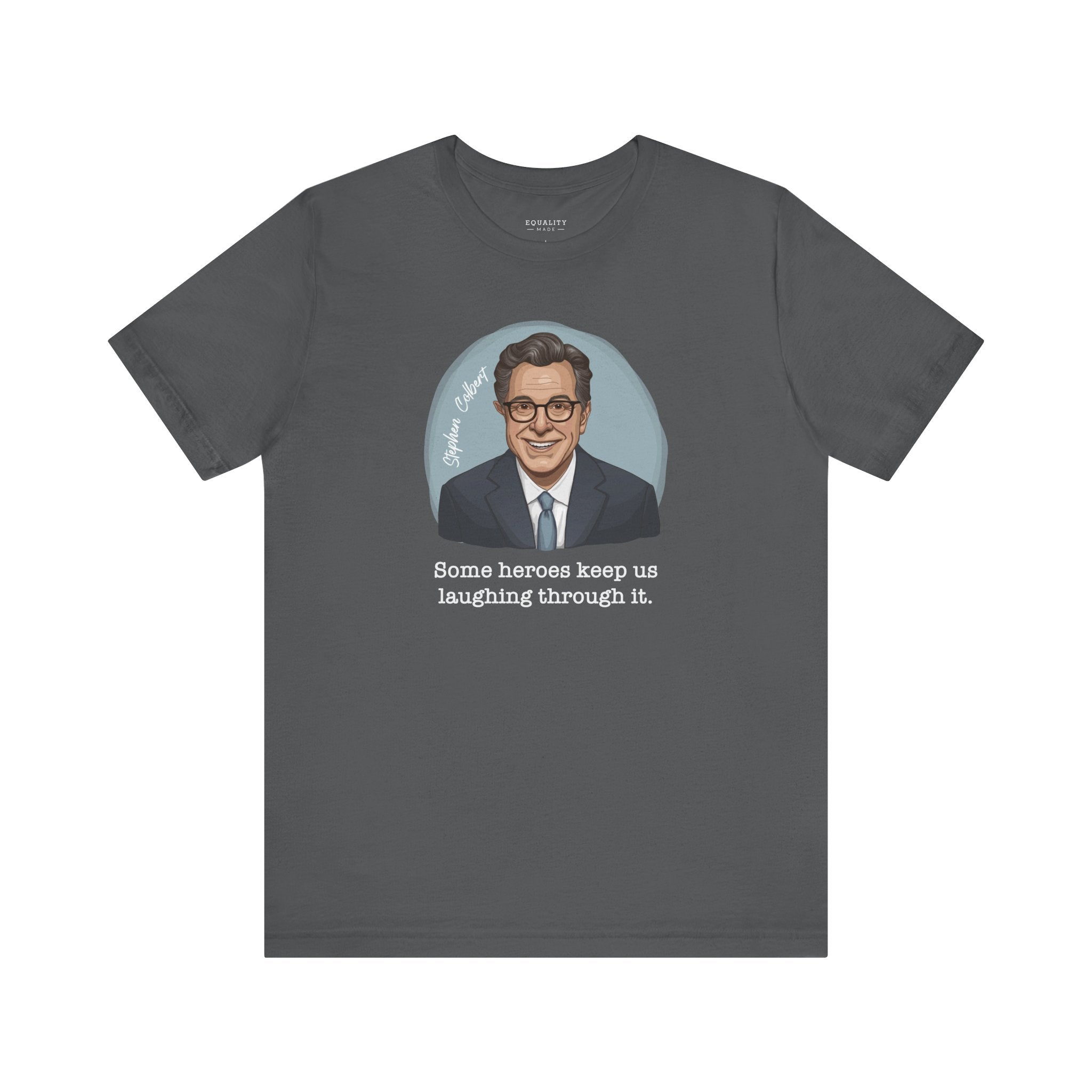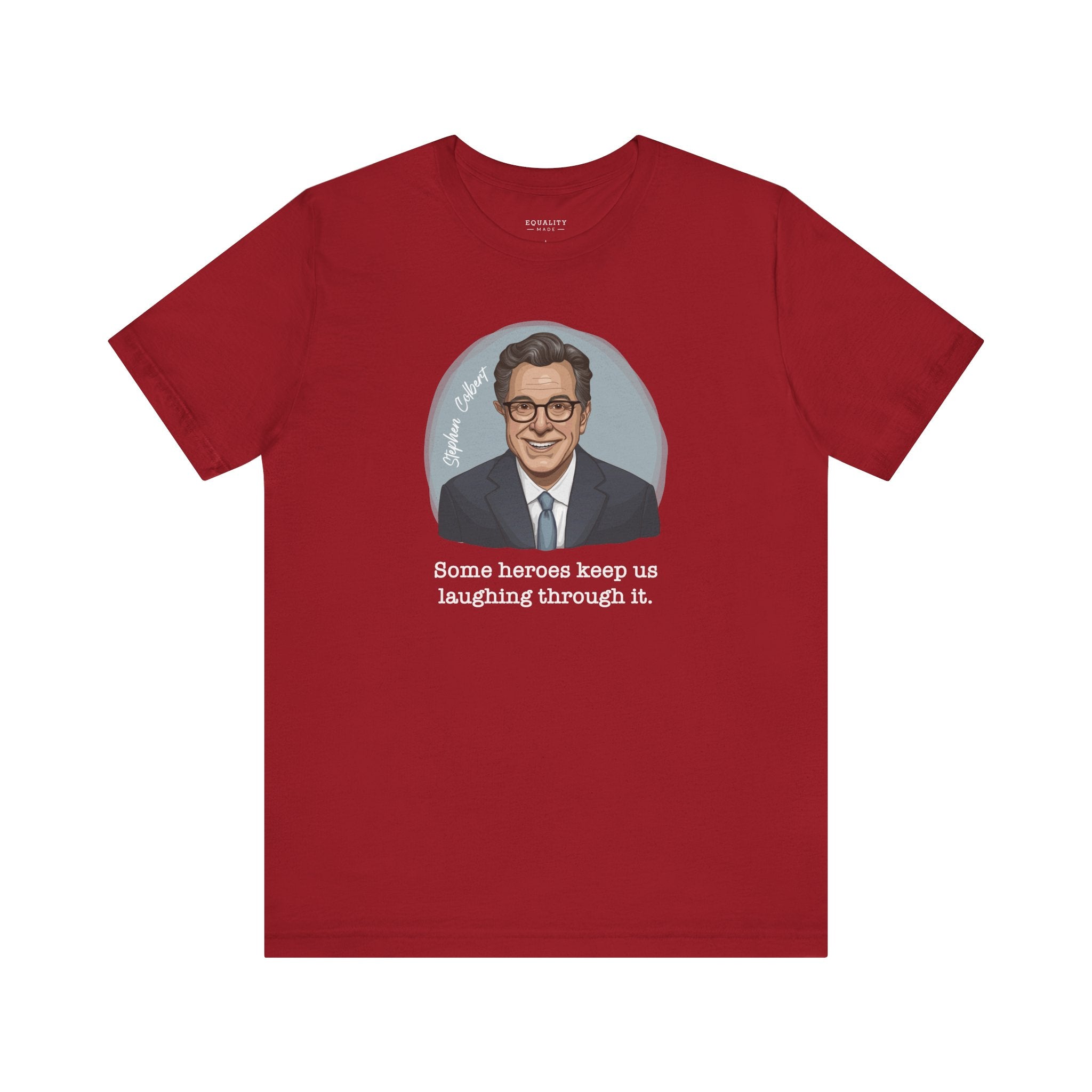 Uplifting tee featuring Stephen Colbert illustration with 'Some heroes keep us laughing through it' text. Celebrate comedy heroes with this inspiring Heroes Collection design.