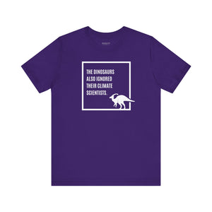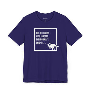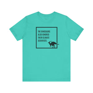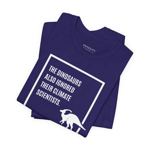 Witty 'The dinosaurs also ignored their climate scientists' tee with parasaurolophus illustration. Make a clever statement about climate change action with this thought-provoking design.