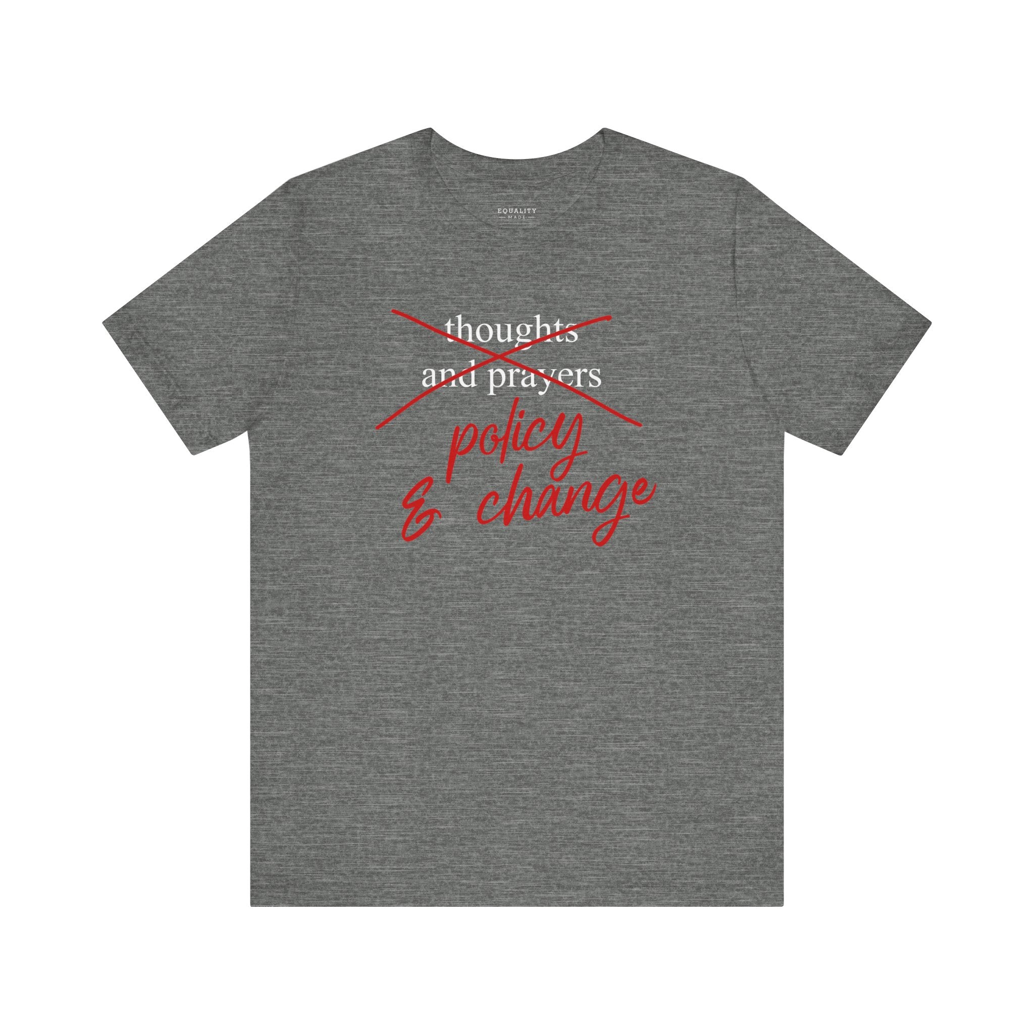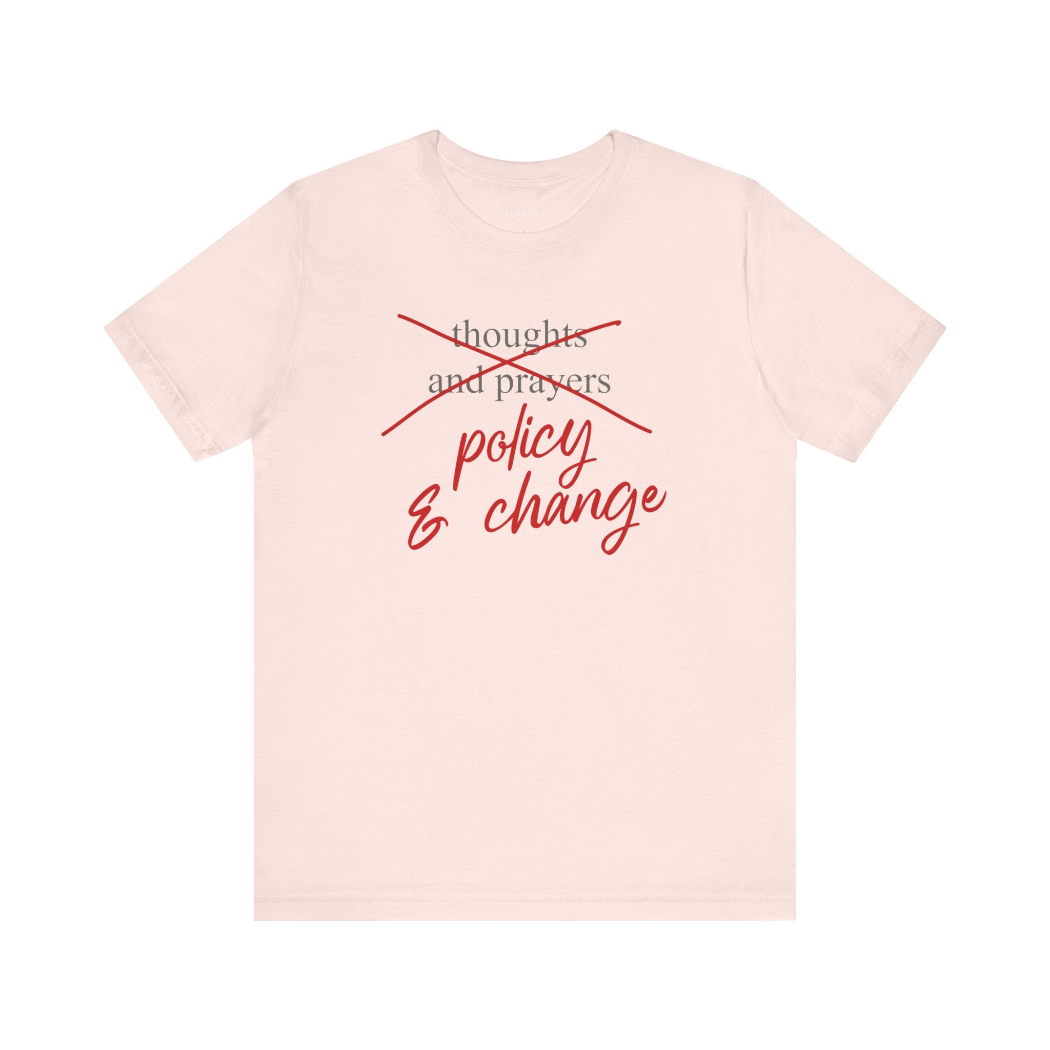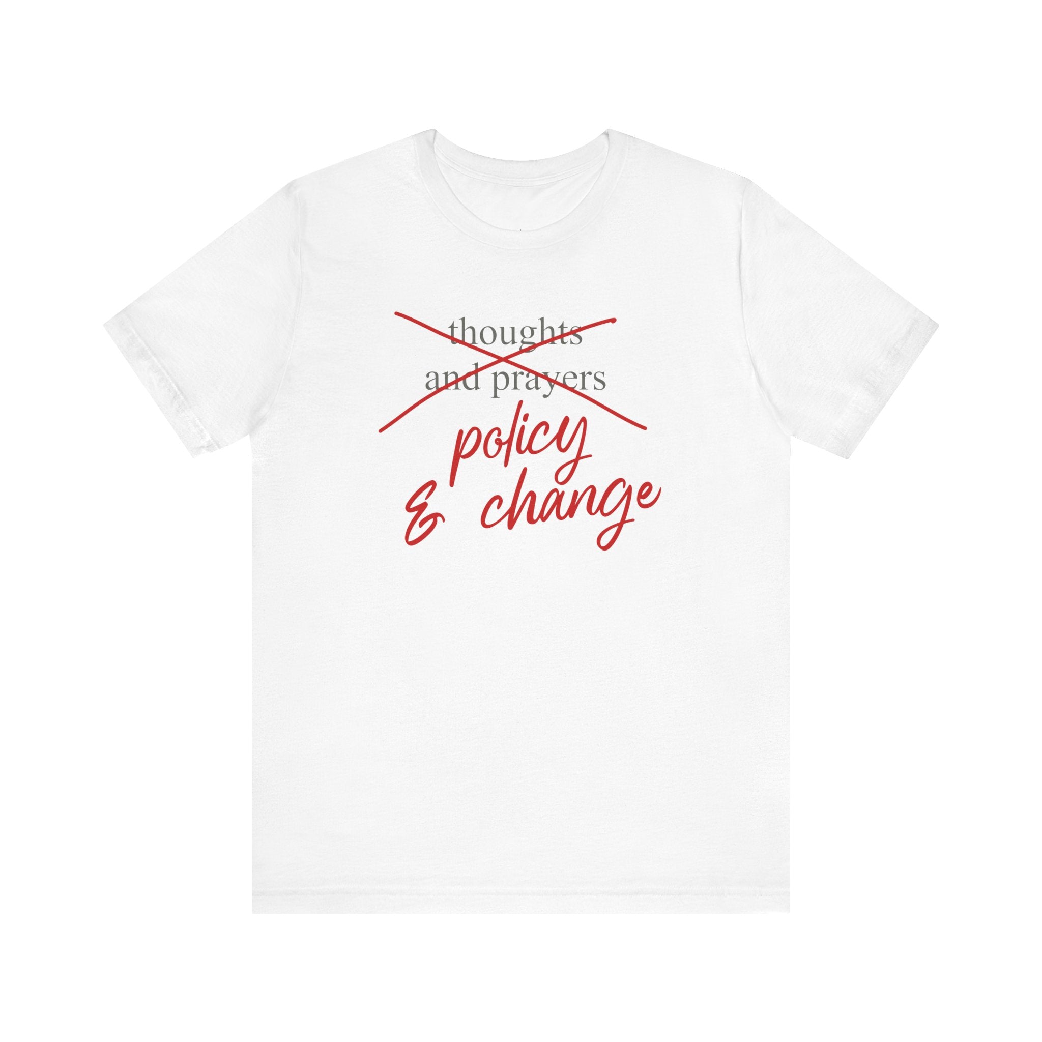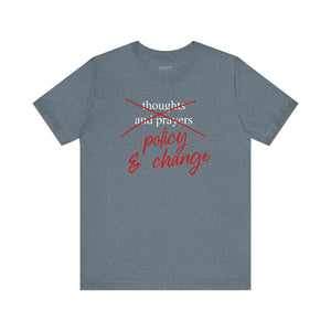 Powerful tee featuring crossed out 'Thoughts and Prayers' replaced with 'Policy and Change'. Advocate for meaningful gun control reform and action over empty gestures.