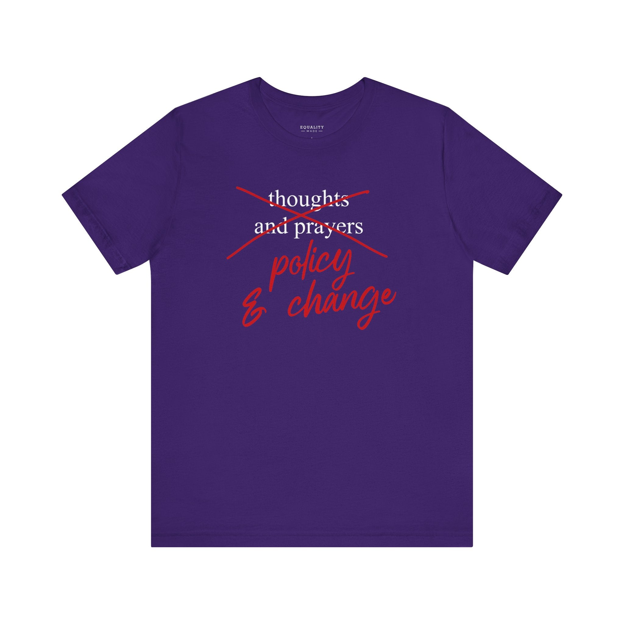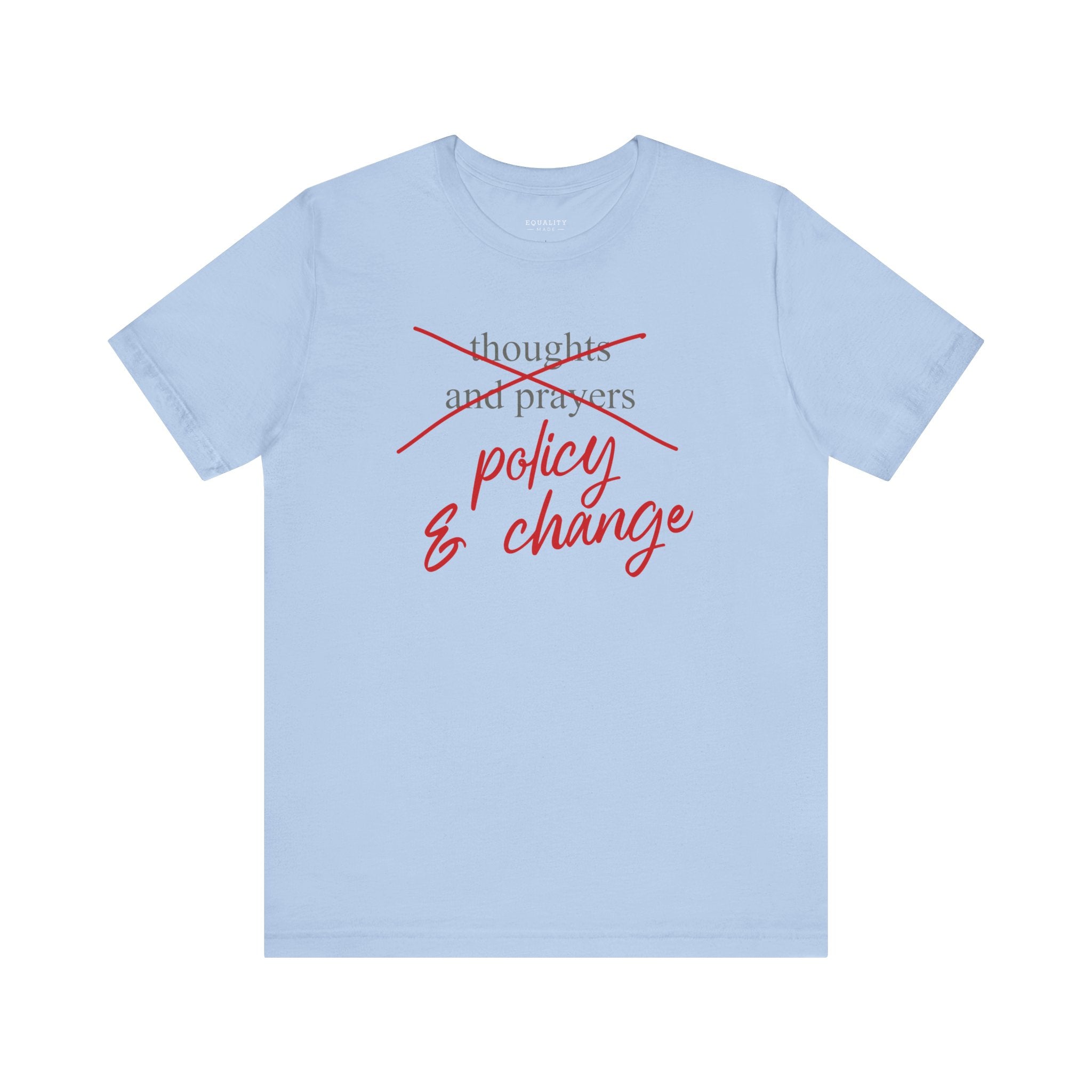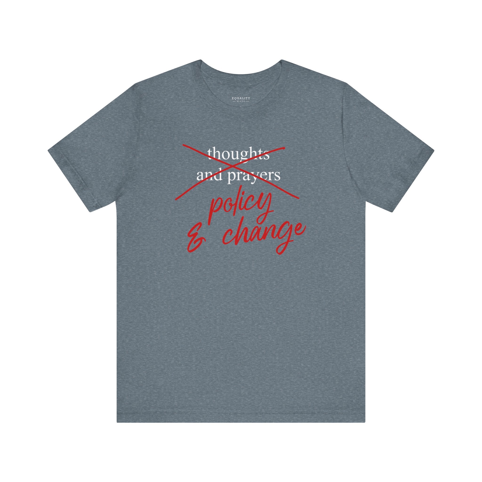 Powerful tee featuring crossed out 'Thoughts and Prayers' replaced with 'Policy and Change'. Advocate for meaningful gun control reform and action over empty gestures.