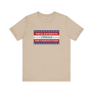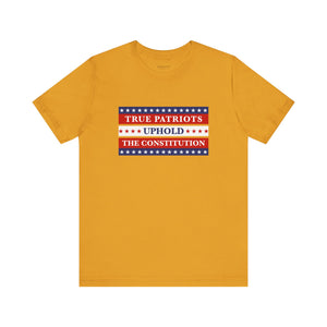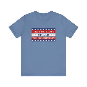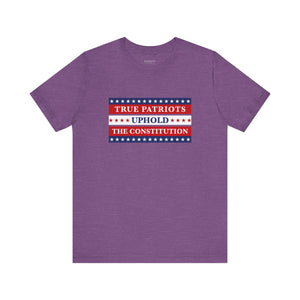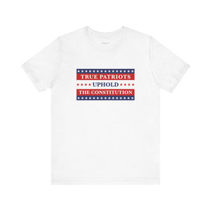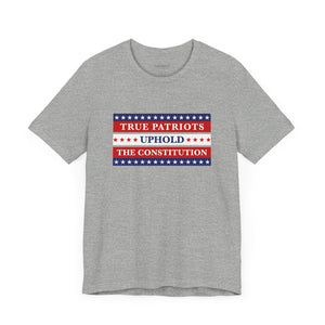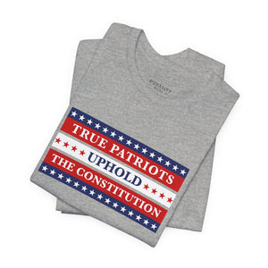Patriotic tee featuring 'True Patriots Uphold the Constitution' with red, white, and blue stars and stripes. Show your commitment to American values and constitutional principles.